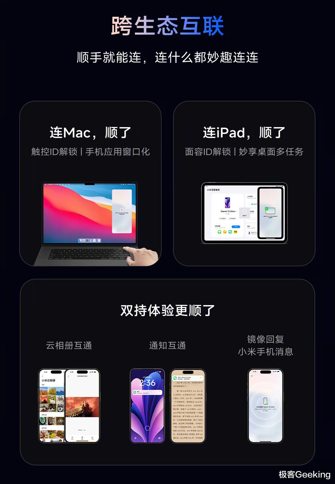 跨生态互联方面,小米打通了和苹果的隔阂,现已接入互联苹果的 iPad 平板和 Mac 电脑设备,并支持触控/面容 ID 解锁,小米首发 iPad 妙享桌面,手机应用也能大屏显示,同时在 iPhone 和小米手机之间实现了云相册互通、通知消息互通和镜像回复。