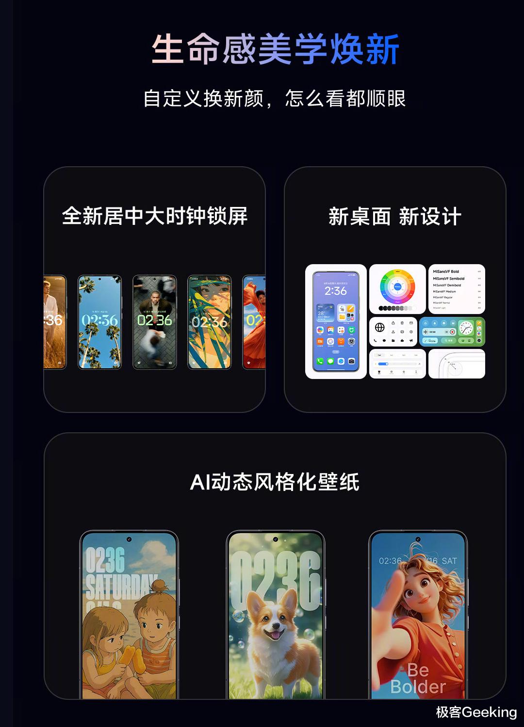 此外新增了 AI 风格化动态壁纸、居中大时钟锁屏和一站式个性编辑的功能。