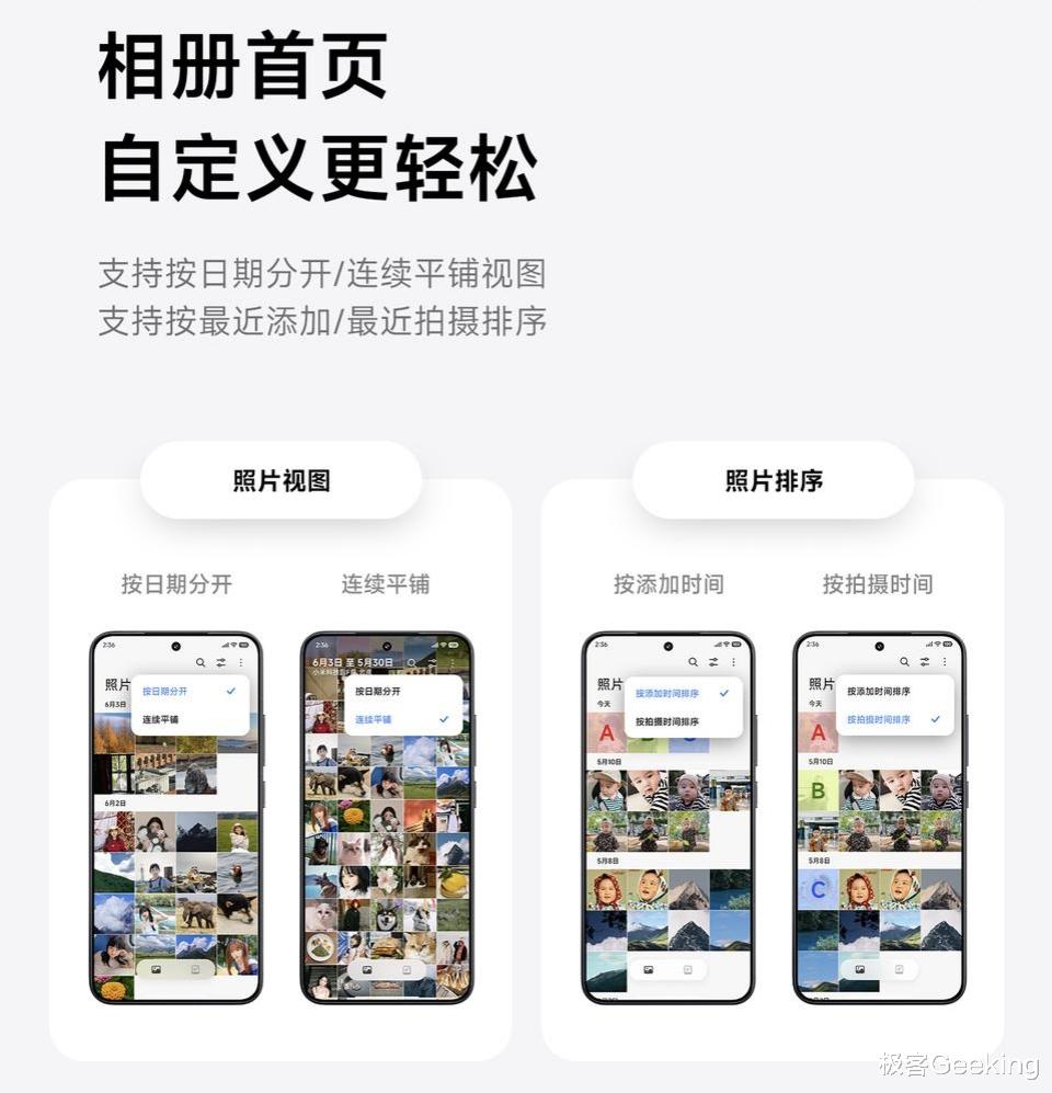 系统相册也有升级变化,现在首页和影集页支持自定义排序了,并支持贴贴分享功能,相册中的照片和视频,贴一下就能到对方相册,而且还支持和苹果手机的贴贴互传。