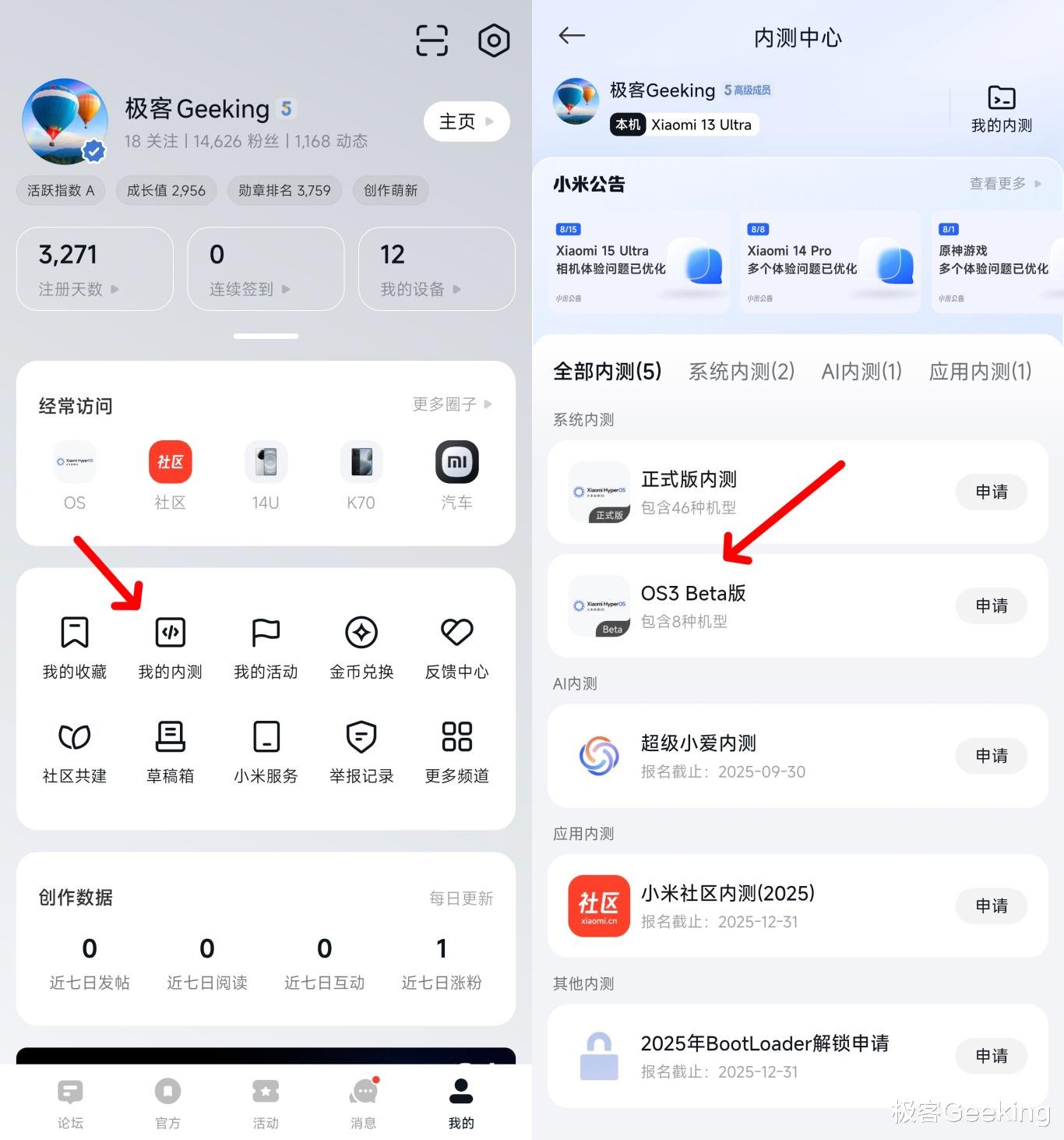 首先打开小米社区 App,接着点击「我的」-「我的内测」进入「内测中心」,在「全部内测」中就会看到新出现的「OS3 Beta」。