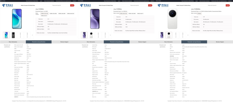 日前,网间曝出了vivo X300系列现身中国电信网站产品库的截图,三款机型的型号分别为V2509A(标准版)、V2502A(Pro版)以及V2502DA(Pro卫星通信版)。根据中国电信网站公布的信息显示,该系列新机将搭载天玑9500旗舰处理器,预装OriginOS 6系统,卫星通信版作为衍生品,仅限16GB+1TB配置提供北斗和天通双模支持。