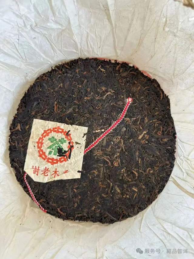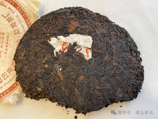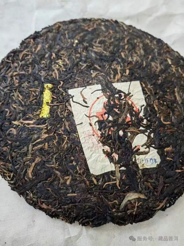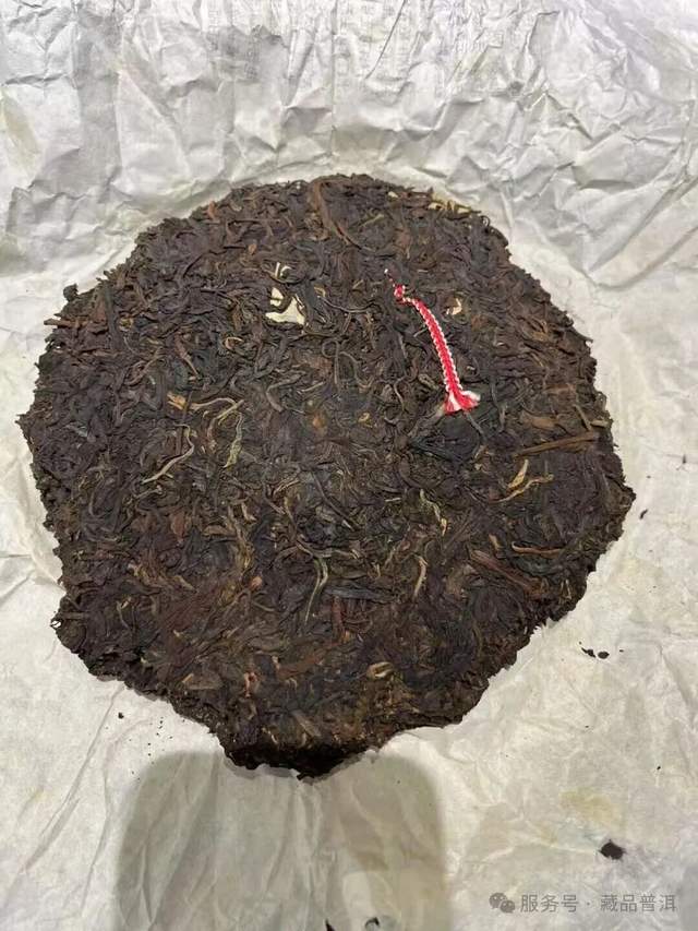 整个茶饼没有内票,有内飞,且压入一条红丝带。茶汤入口稠厚,干仓转化聚香较强,浓强度很高。整道茶汤的茶气很足,水路细腻,喉韵舒适,值得收藏品鉴。