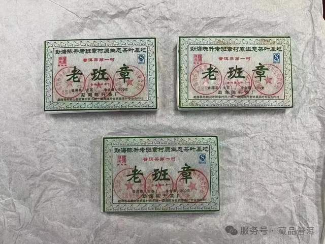 陈升号2008年老班章,是陈升号和老班章村签约合作生产的第一批茶,以老班章核心产区茶料压制而成,是老班章的金字招牌。绵纸上有三个红色公章,非常有辨识度。