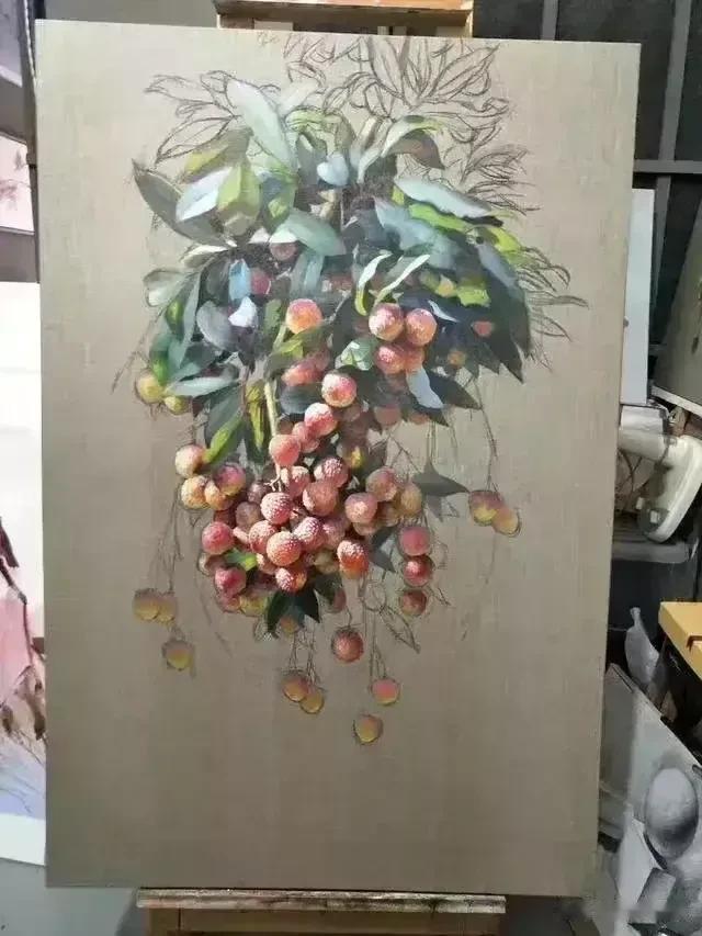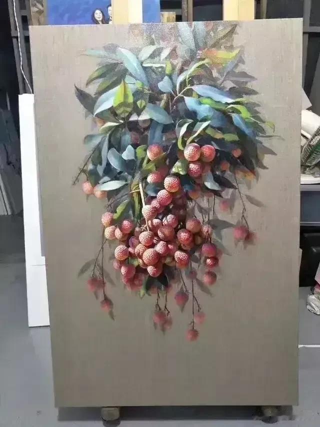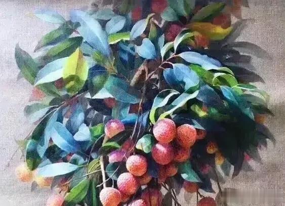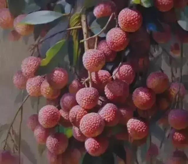 最后进行整体调整,查看色彩是否协调,对比是否恰当,不合适之处再加以修改。如此一步步操作,一幅油画荔枝便绘制完成了。最后整体调整,微调色彩饱和度与明暗对比,确保画面协调统一,让荔枝兼具写实质感与艺术张力。