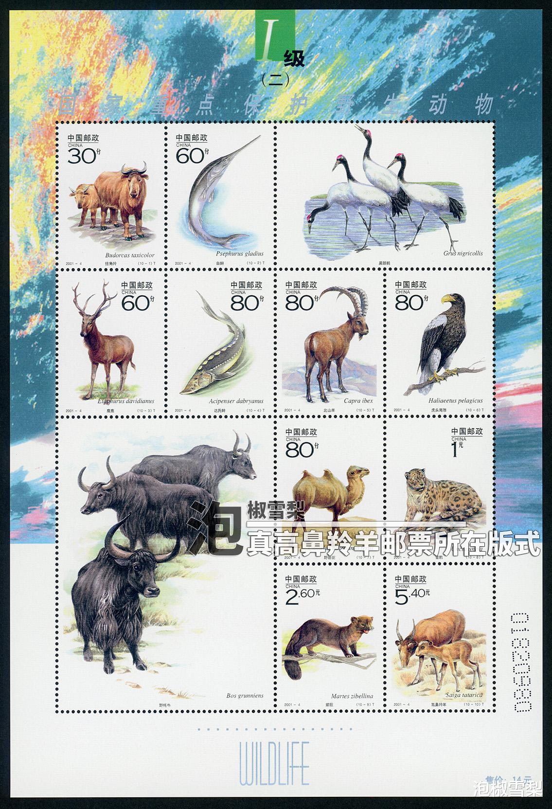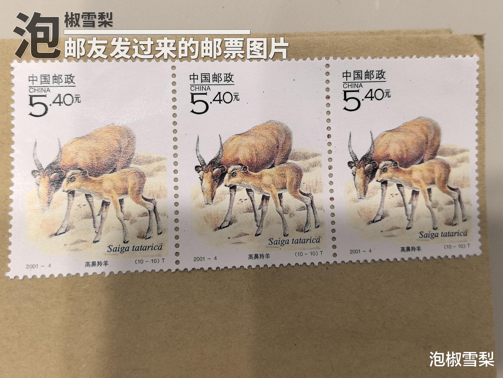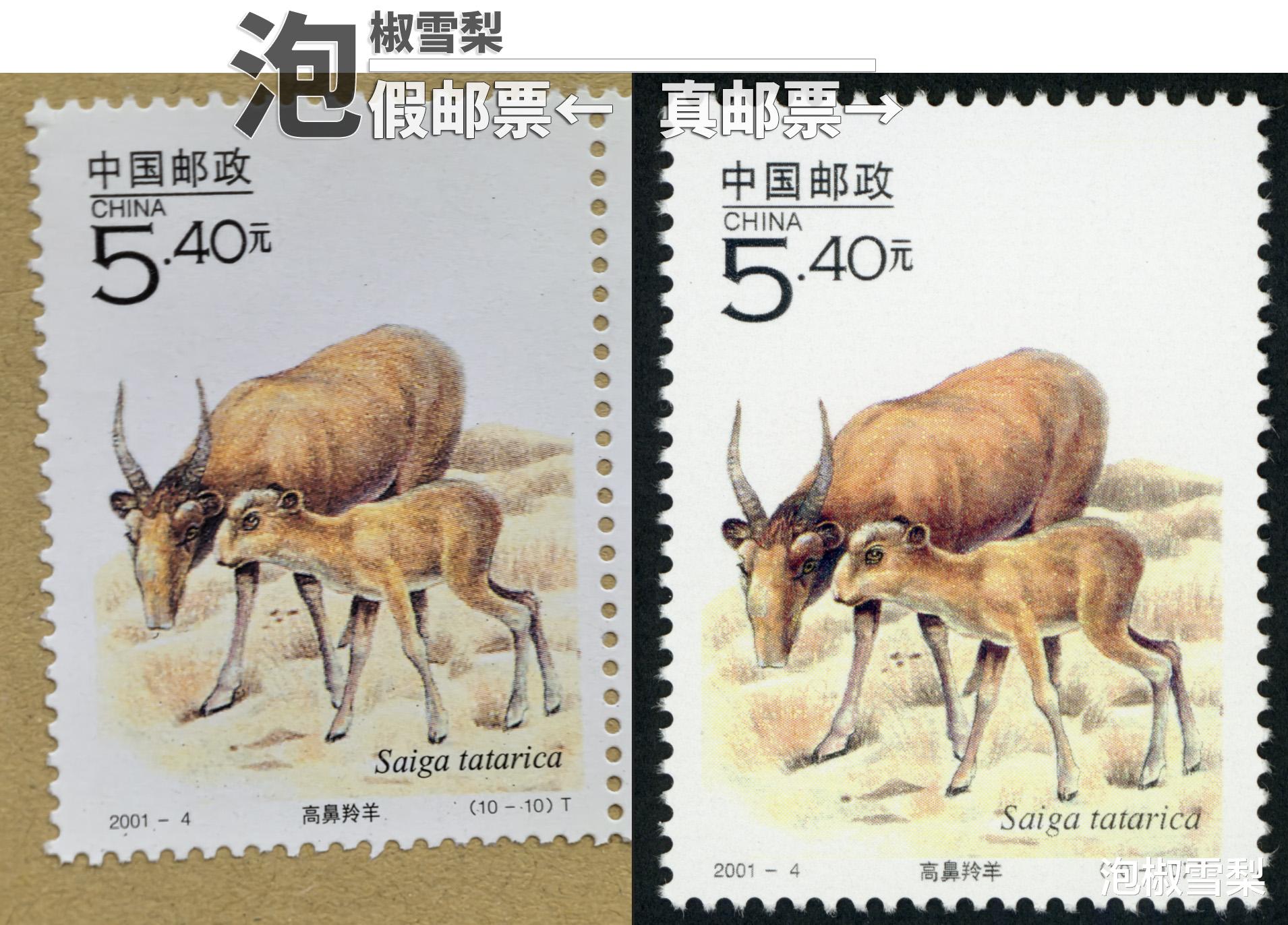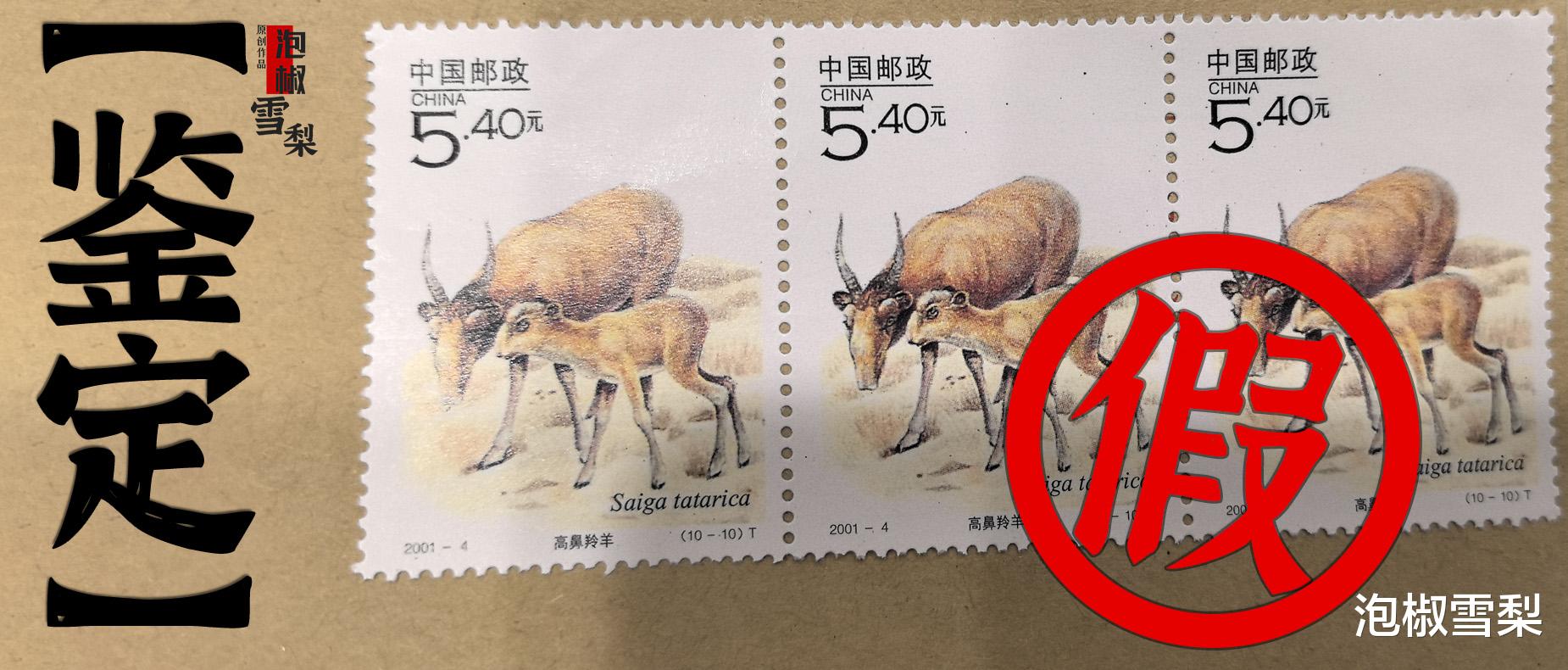 先来看一眼假的依据是什么,2001年“高鼻羚羊”邮票发行时仅有一种版式,为套票版张,也就是说一整版只包含1枚“高鼻羚羊”邮票,所以相同的几枚“高鼻羚羊”连在一起的版式一定为假邮票。