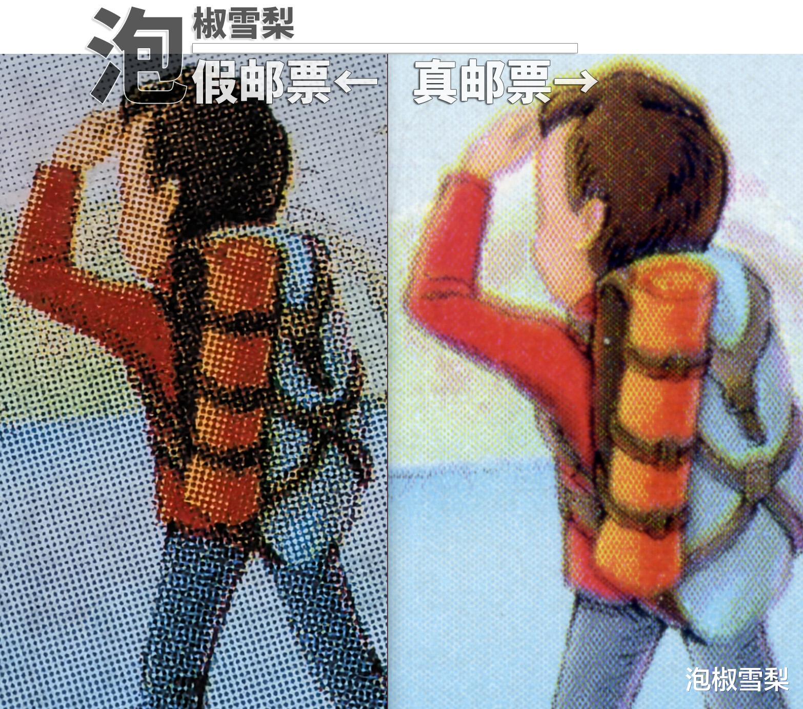 其次在邮票细节上,两者完全没有同等的清晰度,虽然真邮票也能看到网点,但假邮票的网点为圆形且稀疏,真邮票则为菱形点,其中人物脸部部分菱形网点内还能看到影写版特征的空心效果,从这个细节上也能证明假邮票采用的是胶版印刷。
