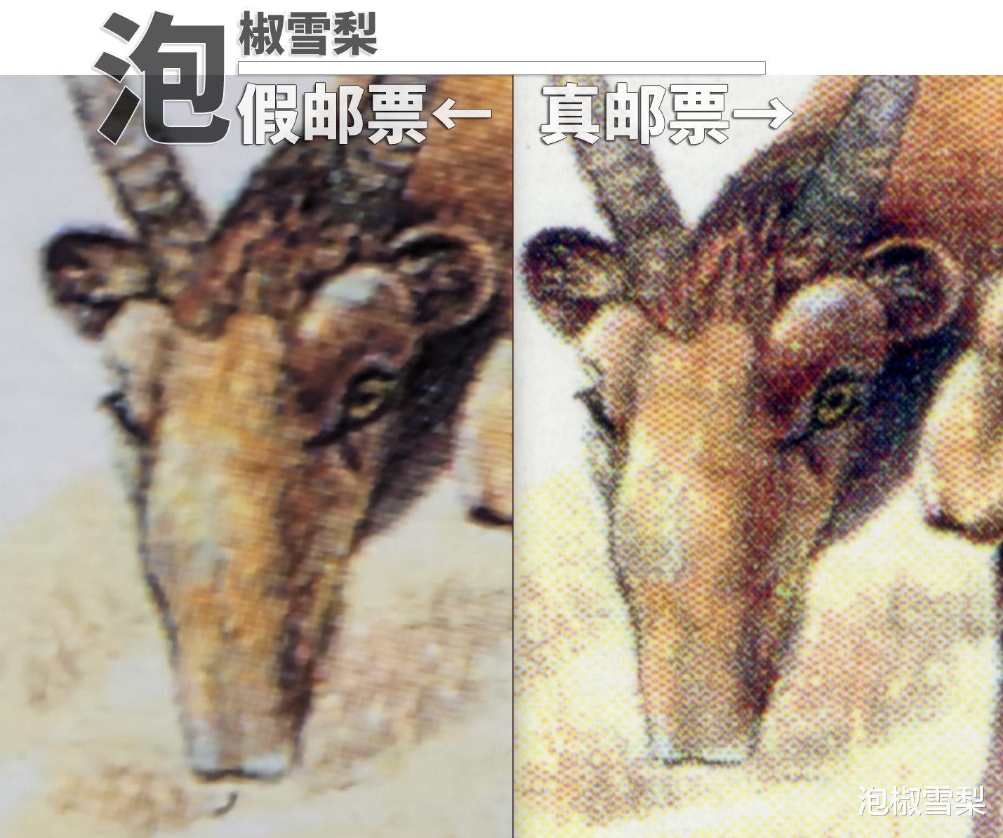 其次,由于造假者是先扫描真邮票再印刷的假邮票,所以即使胶版印刷机的精度足够高,也会在扫描和打印两个过程中造成细节丢失,如较大只的“高鼻羚羊”,真邮票上的瞳孔为椭圆形,假邮票不但印扁了,还和眼眶连在了一起。