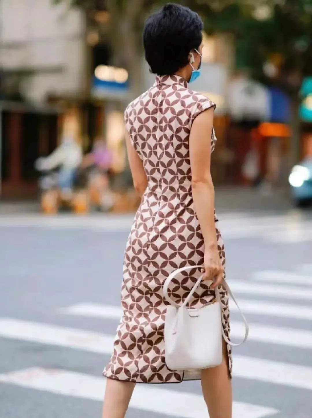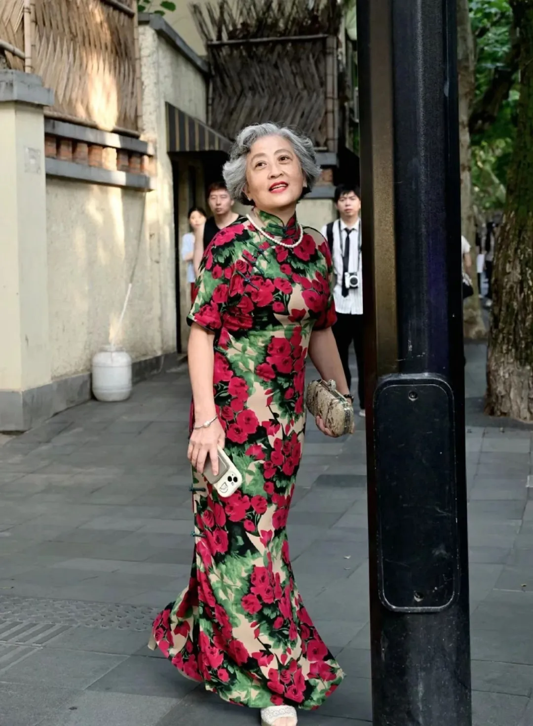 如果选择款式复杂的印花旗袍,用简约的包包、耳饰点缀即可,让整体穿搭更协调
