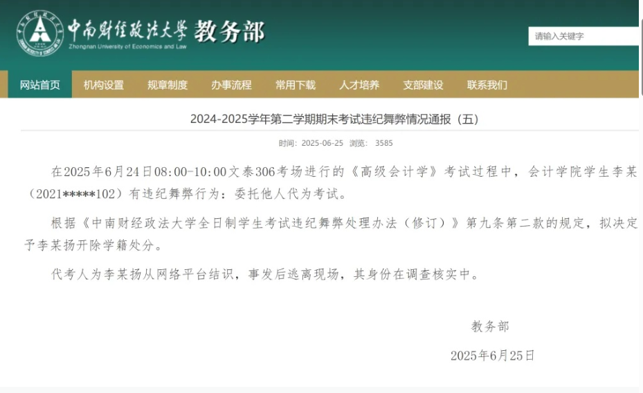 知名211大学通报一起“男扮女装替考”事件,拟开除学籍?就在昨天25号晚,中南财经大学教务部官方网站发出了《2024-2025年第二学期期末考试违纪舞弊情况通报(五)》,短短百余字中透露出的信息量却很大。