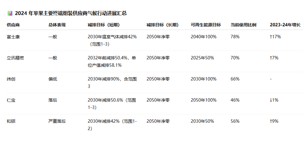 然而,报告指出,苹果的绿色转型在其供应链环节仍面临挑战。虽然整体趋势向好,但部分核心供应商的表现明显落后,成为苹果实现气候目标的“短板”。