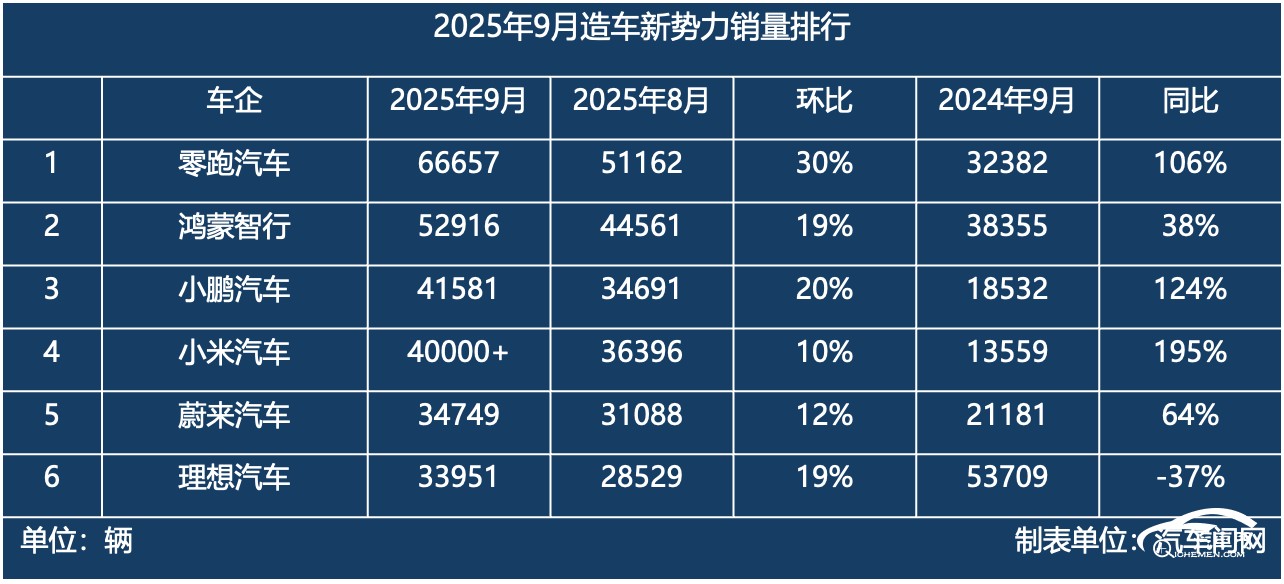 10月1日,多家造车新势力陆续公布了9月销量“成绩单”。从整体来看,绝大多数造车新势力销量上涨,多家造车新势力车企销量创下历史新高。零跑汽车领跑销量榜,鸿蒙智行、小米、小鹏、蔚来表现也较为突出,但旧有的“蔚小理”格局已被彻底打破,新销量梯队正逐渐形成。这篇文章我们就来分析9月造车新势力销量具体表现。