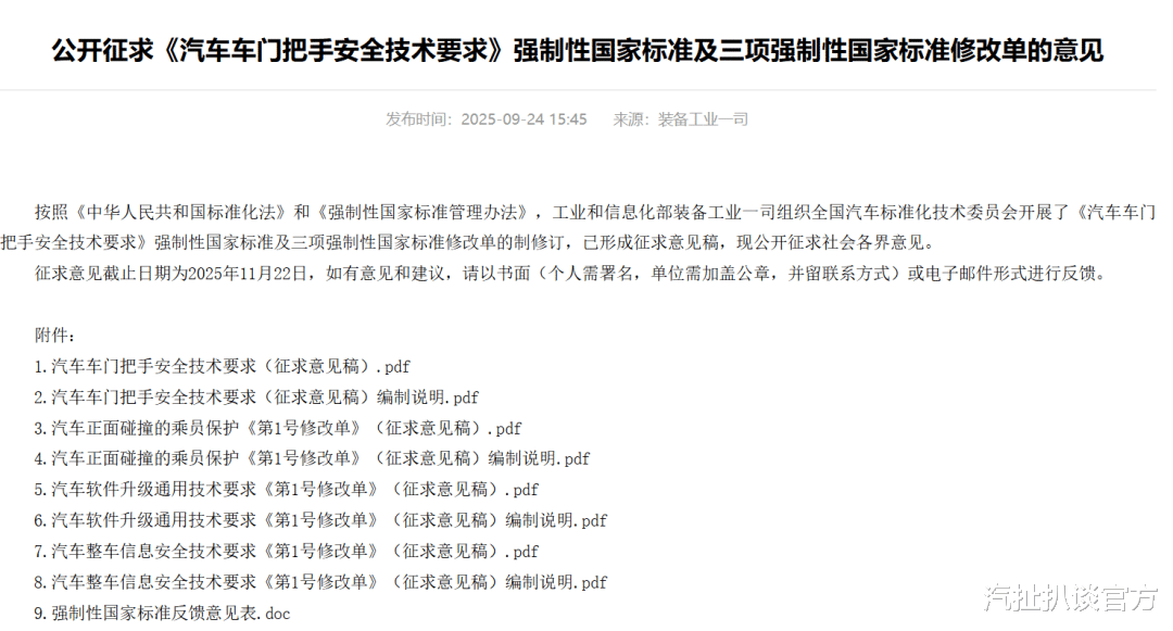 工业和信息化部装备工业一司于近期发布通知,对《汽车车门把手安全技术要求》强制性国家标准公开征求意见。这项标准旨在解决随着电动隐藏式车门把手普及而出现的安全隐患。虽然新标准还是在公开意见征集中,但是按照惯例不会有太大变化和调整。