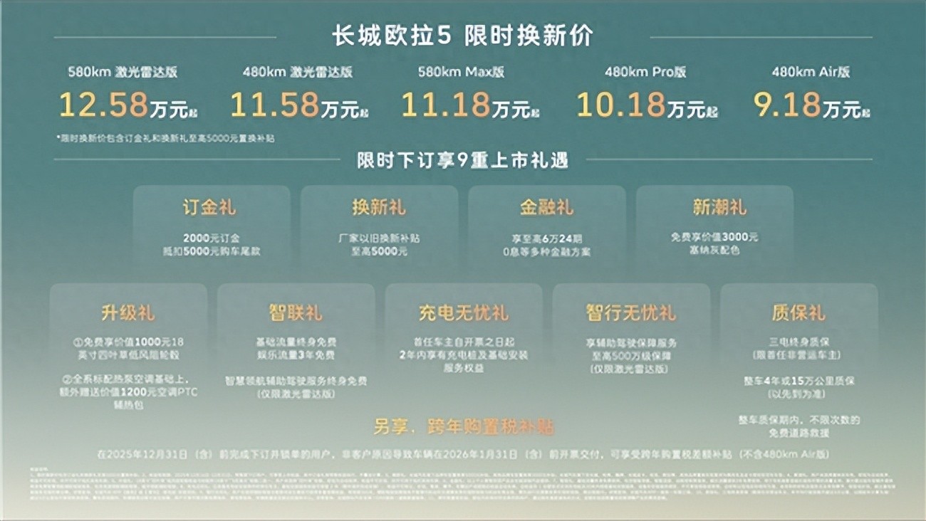 【中国·保定】2025年12月16日——今日,长城汽车欧拉品牌全新A级纯电SUV——长城欧拉5正式上市。新车共推出5款配置,建议零售价区间为 9.98万至13.38万元,限时换新价9.18万元起(限时换新价包含“订金礼”和“换新礼”至高5000元以旧换新补贴)。为回馈广大用户的热爱与支持,即日起至2025年12月31日,用户下订并锁单即可尊享包含订金礼、换新礼、智行无忧礼在内的9重上市好礼,以及跨年购置税补贴(不含480km Air版)等丰厚购车权益。凭借诚意十足的价格权益与越级产品力,长城欧拉5致力于成为全球年轻用户的“严选搭子”。
