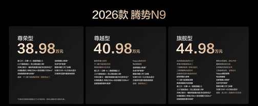 9月17日,2026款腾势N9正式上市,共推出尊荣型、尊越型、旗舰型3款车型,官方指导价38.98万元~44.98万元!