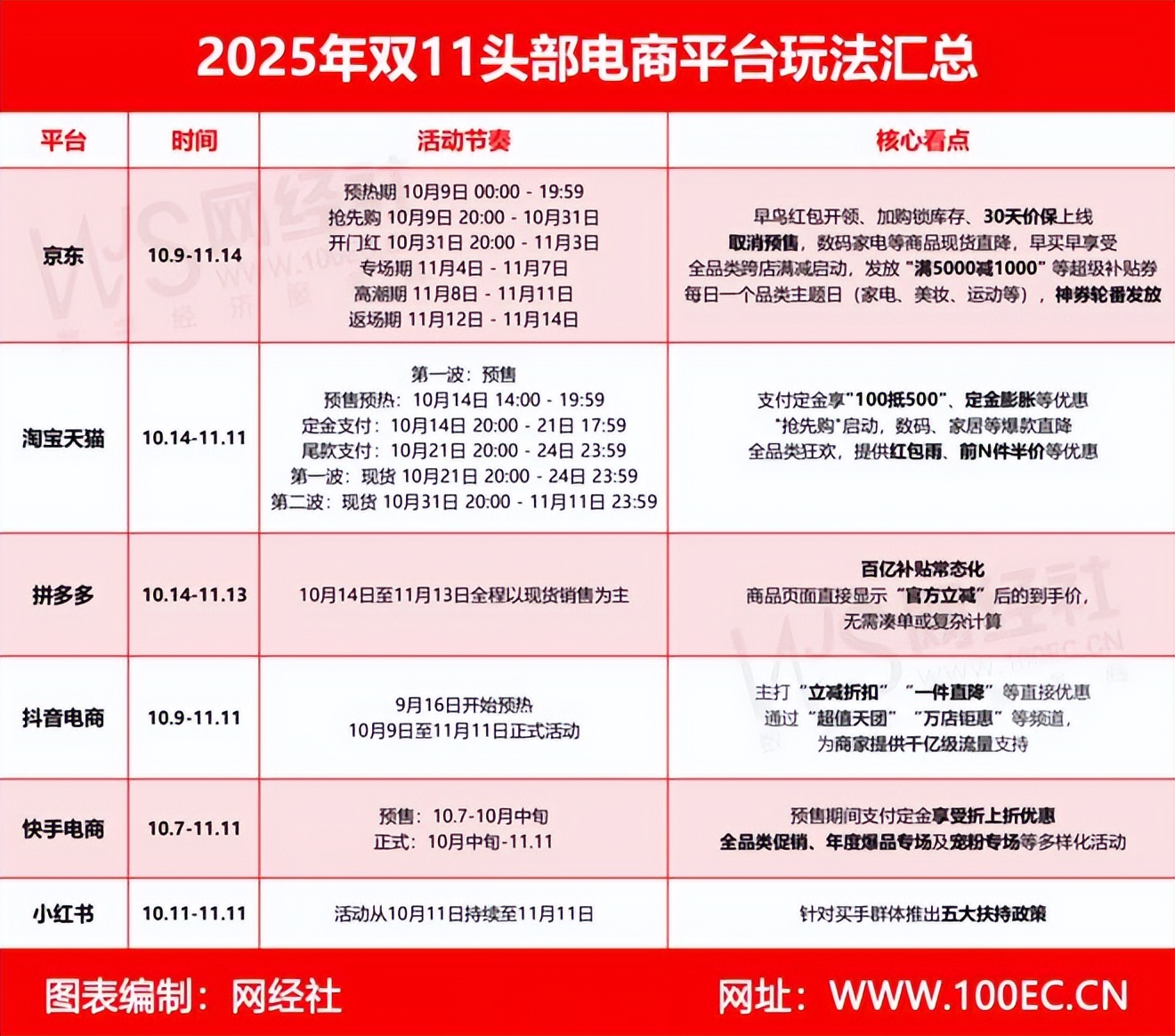 正式期将从10月中旬持续至11月11日,期间将推出全品类促销、年度爆品专场及宠粉专场等多样化活动。平台在蓄水期投入180亿流量补贴,全周期流量支持达数千亿规模,并为正式期配置了20亿用户红包和10亿商品补贴,以助力商家提升转化率并激活新老客户。