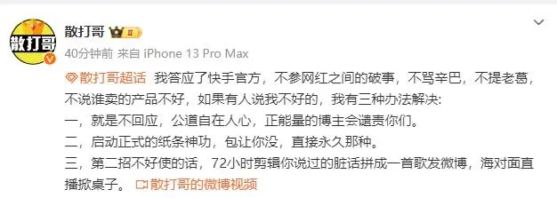 不过散打哥从来对自己的实力是很有自信的,所以当外界对他这次的回归反响并不强烈后,打哥的内心很是不爽。可是由于需要对快手兑现自己乖宝宝的承诺,像以前那样的开皮网红变得不可能,散打哥只好转移阵地,开始了回归后在微博上的第一轮叫嚣。