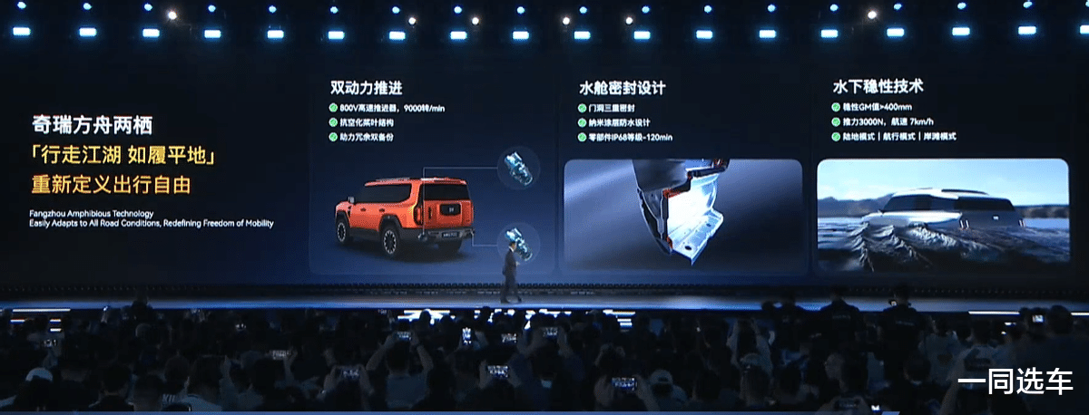 奇瑞方舟两栖技术,双动力推进,800V高速推进器,推力可达到3000N;发动机、电池以及电器件和插接件等核心零部件实现IP68级防水,保证2米水深120分钟内不进水。2025年10月16日,纵横G700凭借方舟两栖系统化长江天堑为坦途,成为百年汽车工业史上首款成功横渡长江的越野车。