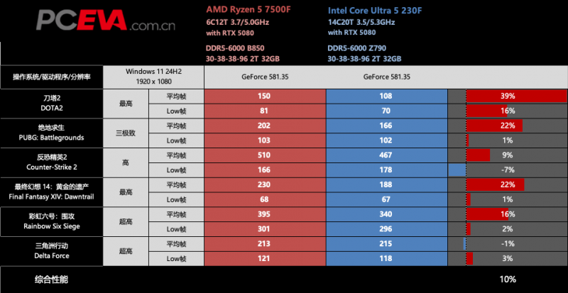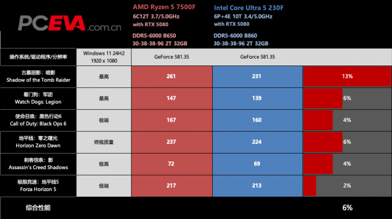 先看单机游戏部分,锐龙5 7500F在6款游戏里的成绩基本能全胜Ultra 5 230F,其中领先幅度最高的是《古墓丽影:暗影》,足足拉开了13%的差距。其他几款游戏,如《看门狗:军团》、《使命召唤:黑色行动6》、《地平线:零之曙光》等,锐龙5 7500F也能领先Ultra 5 230F大约5%左右,6款游戏综合下来,锐龙5 7500F领先6%。