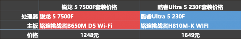 锐龙5 7500F这边是搭铭瑄挑战者B650M D5 Wi-Fi,套装价格1248元;酷睿Ultra 5 230F这边是搭配铭瑄挑战者H810M-K WIFI,套装价格1649。可以看到锐龙5 7500F的板U价格,不但便宜400元左右,而且主板的定位也略高一些,如果230F要搭B860带WiFi的主板,价格至少要上到1800元左右,这差距就太大了。B650作为2023年发布的主板,价格已经非常平稳,且AM5接口的主板会用到2027年,以后你升级电脑,就算要把主板和CPU出掉,锐龙5 7500F+B650M的残值也要优于现在不断降价的Ultra 5 230F+H810M套装。
