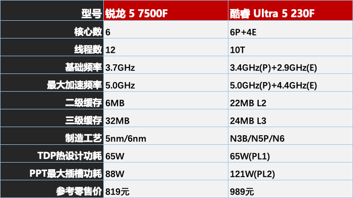 本次评测选择了Ultra 5 230F来进行对比,这是英特尔Ultra 200S系列的黑盒处理器,地位类似于之前的14490F,采用6大核+4小核的设计,因为英特尔这代处理器不支持超线程,所以和6个纯大核的锐龙5 7500F对比,线程数反而少了2条,加上4个小核对于游戏性能毫无帮助,规格上反倒落后于7500F。其他规格如缓存和功耗,也是老生常谈的部分,锐龙5 7500F三缓更大,Ultra 5 230F二缓更大,功耗则是7500F更低,只有88W。价格部分,Ultra 5 230F首发价格其实是1999元,不过因为销量不佳,目前降至比锐龙5 7500F贵170元左右,直接踩进了千元级市场,两颗处理器都在千元左右,注定必有一战,就让我们看一下是老将更强还是新兵上位。