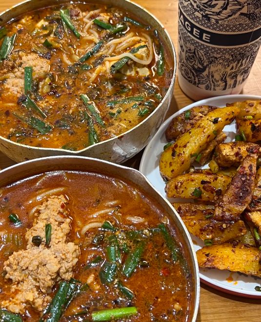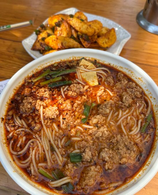 凉米线,则是江湖中的隐士。米线过冷水,拌入酸甜的酱汁,撒上花生碎、韭菜段、胡萝卜丝,再淋一勺油辣子,红白绿三色交织,清爽中透着泼辣。夏日的昆明街头,凉米线摊前总围满食客,筷子一挑,米线裹着酱汁滑入口中,酸辣开胃,瞬间驱散暑气。老昆明人讲究“凉米线要配木瓜水”,清甜的木瓜冻与酸辣的米线,一冷一热,一甜一辣,恰似高原的天气,说变就变,却总让人回味无穷。