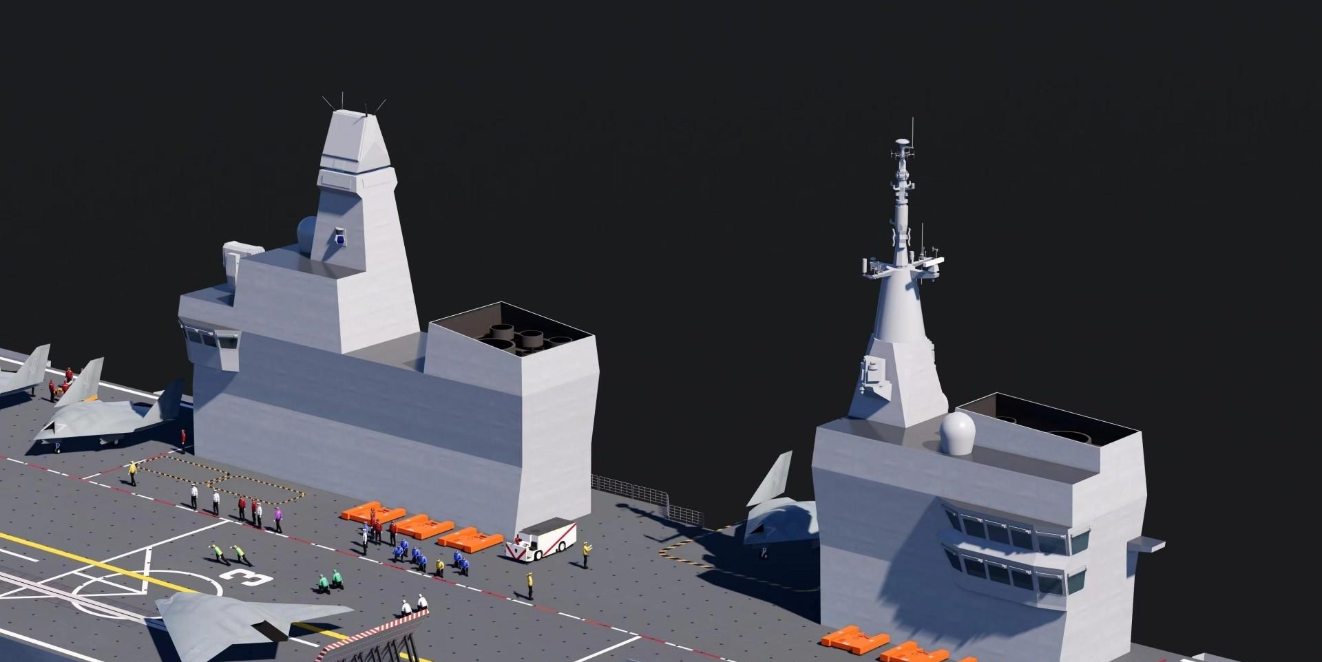 根据我个人的一些推测,076这种新概念航母的电力跟动力系统。可能会采用2台20兆瓦以上的燃气轮机,跟4到6台5兆瓦以上的柴油机。而为了降低舰岛的体型,这个前后的排烟口横跨度应该比较大。所以可能会采用纵向布置的方式,来安排整个动力系统。所以设计双舰岛布局更加适合,当然这都只是个人的猜测而已。大家有不同看法也可以在评论区表达出来,我们一起愉快的讨论。而这个双舰岛还可以区分航空指挥和航海指挥职能,也可以增加抗风险能力。比如在战时一个舰岛被摧毁,还有另外一个还可以使用。再者就是双舰岛可以释放出更大的中间跟后甲板宽度,无人机可以在中后甲板跑道滑跑起飞等等。