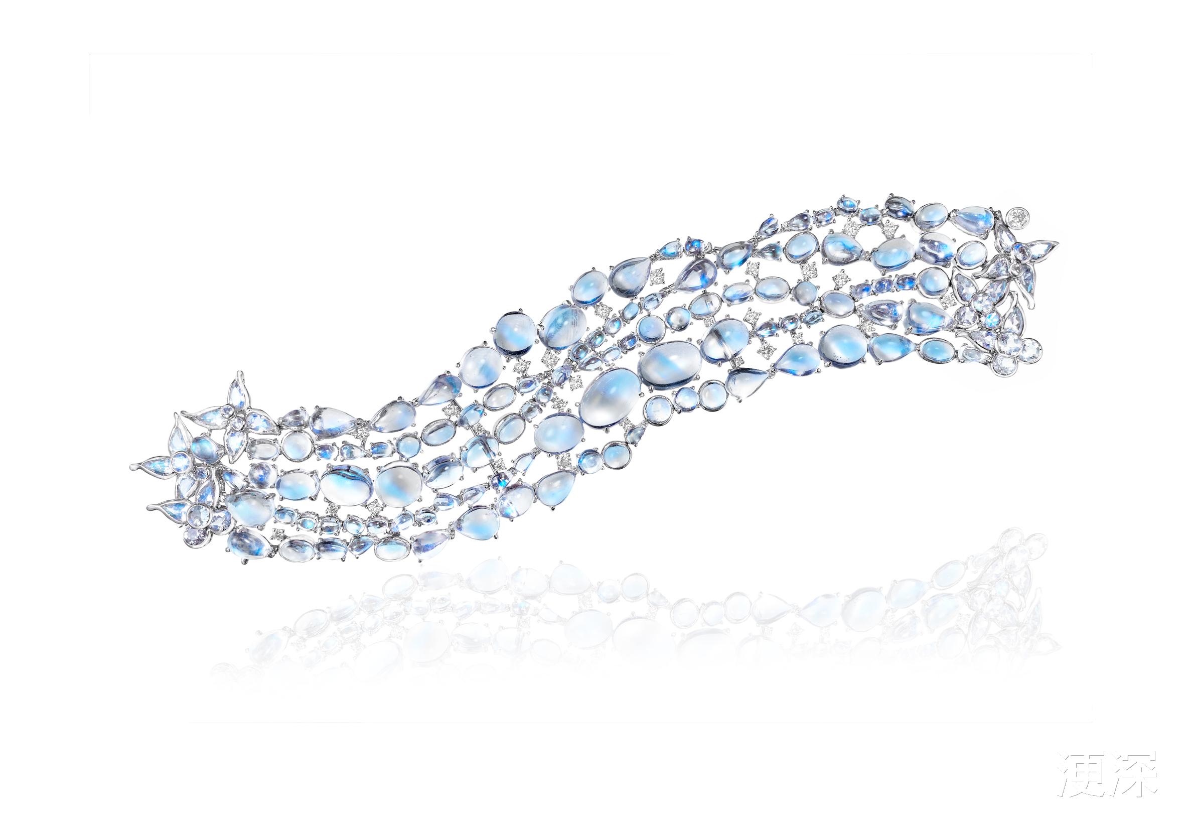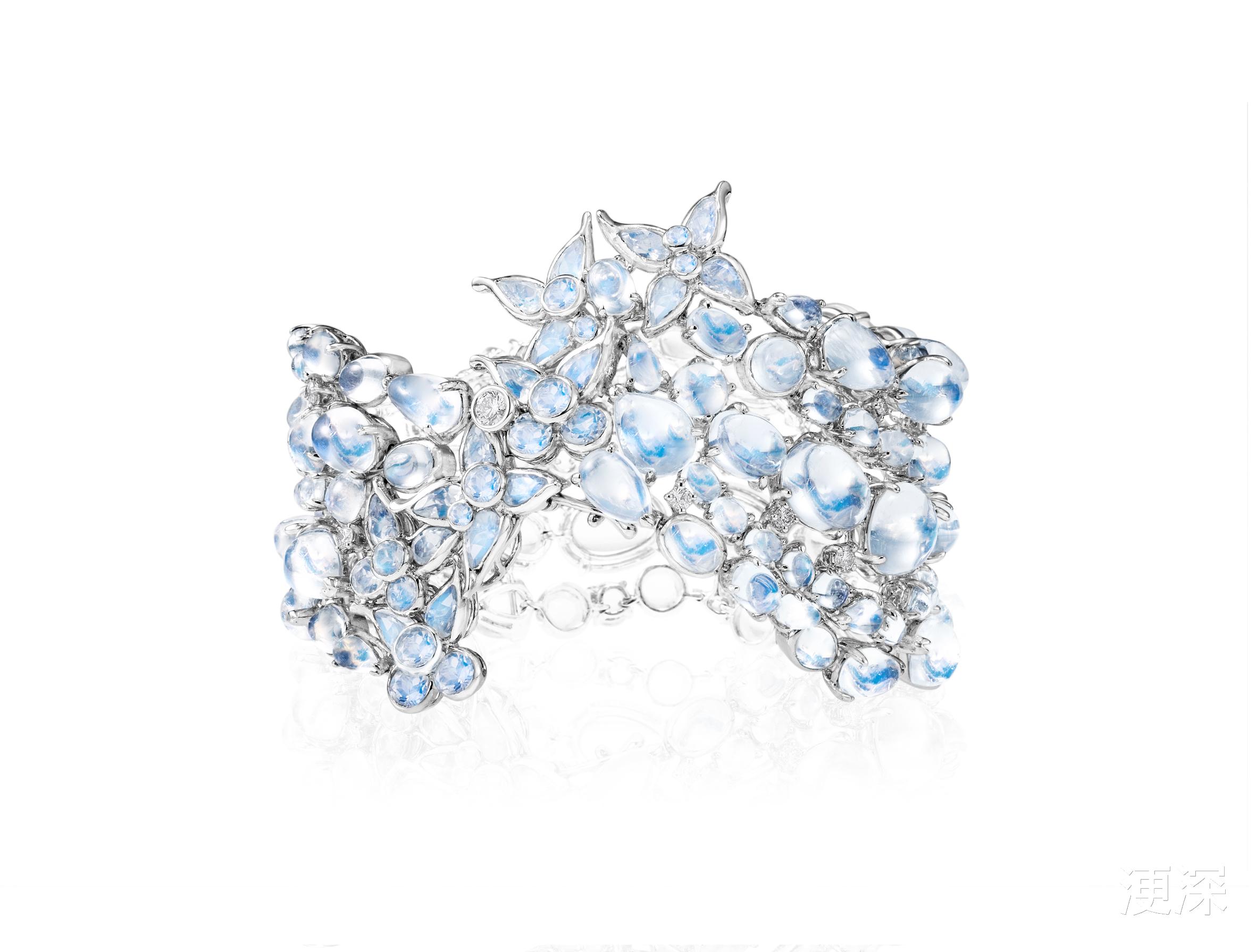 Anna的创作灵感源于对音乐与自然之美的热爱,更是融入中秋文化中的“月圆人圆”意象。舞蹈的旋转节奏转化为珠宝的流动线条。月光石与钻石交错铺排,如旋律般起伏,而蝴蝶元素则象征蜕变与重逢——正如中秋时节人与情感的永恒相聚。淡蓝色调与中秋夜空遥相呼应,佩戴间仿佛将一轮明月环绕腕上,赋予现代女性温婉而坚定的力量。