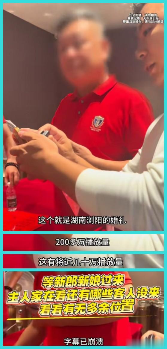 某哥赶紧拿起手机给新郎父亲看,他在其他地方蹭酒席,有多少播放量,想以此来打消新郎父亲的顾虑。