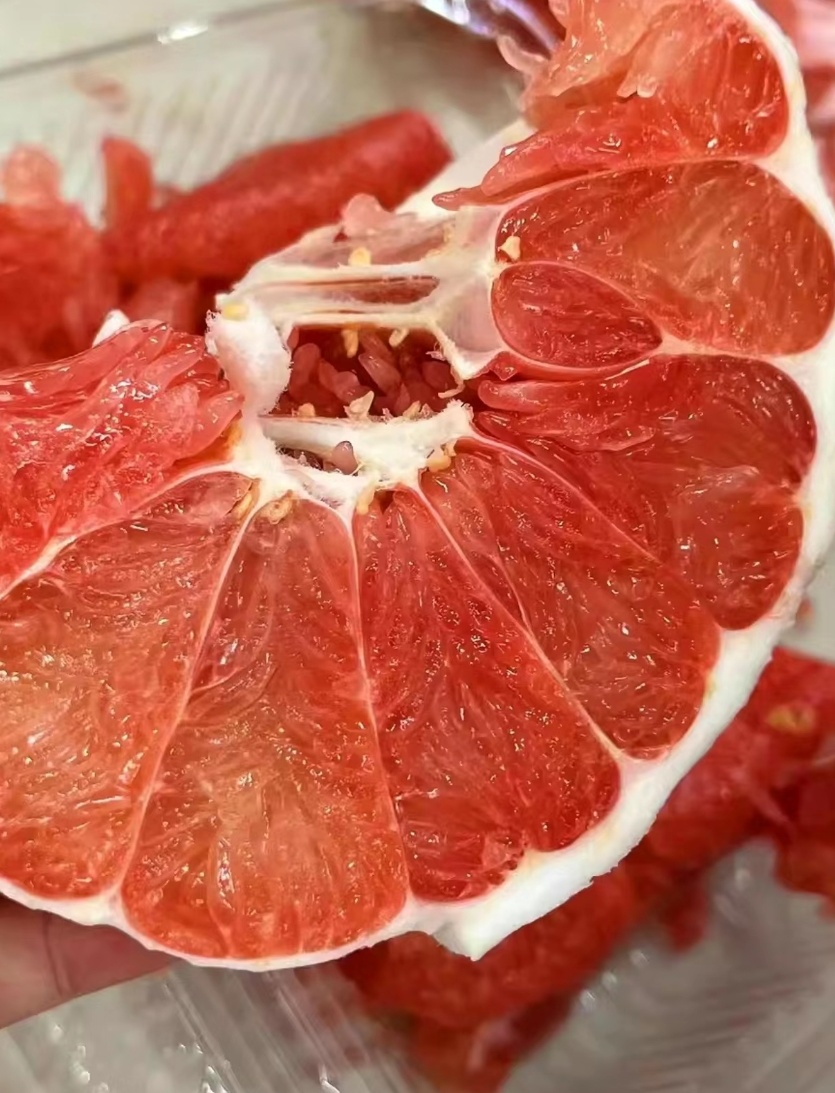 琯溪蜜柚中的极品,因皮红、瓤红、肉红而得名。果大皮薄,果肉晶莹剔透呈淡红色,汁多柔软,甜度14-16度。富含的番茄红素和β-胡萝卜素让它的营养价值更胜一筹。平和县特有的火山岩土壤和充足的日照,造就了这款蜜柚的优良品质。9月底开始上市,因其外观漂亮、口感佳,成为节日送礼的热门选择。