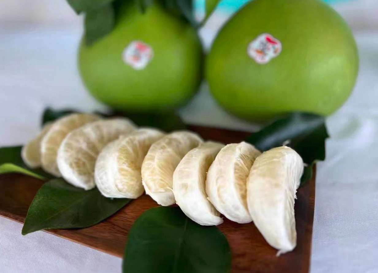 作为柚子界的“新贵”,澄迈无籽蜜柚打破了人们对柚子的传统认知,即便完全成熟,它依然保持着青绿色的外衣。澄迈青柚果肉晶莹剔透,汁水充足,甜度高而酸度低,口感清爽怡人。这得益于海南独特的热带气候和富硒土壤,让这款柚子8月底就能抢先上市,成为柚子季的“开路先锋”。