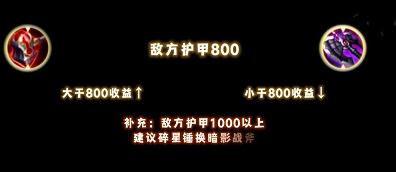 也就是斧子加锤子一起的收益,800护甲为分界线,当敌方超过800护甲,双穿收益往上涨,低于800护甲收益会没那么高,这就是第三个结果了。