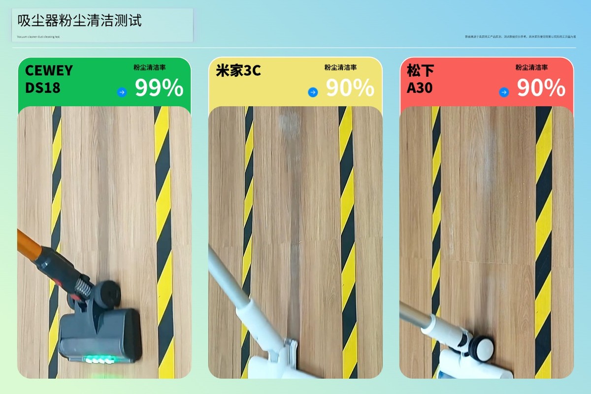 测试总结:一次清洁率优秀:CEWEY一次清洁率良好:松下一次清洁率一般:米家实际测下来,CEWEY DS18 表现还挺让人惊喜的。像猫砂、瓜子壳还有碎纸屑这些小颗粒,我推着它扫一遍,大部分就能清干净了。而且滚刷转的时候特别稳,没出现把垃圾推飞或者弹出去的情况,这点用着很省心。