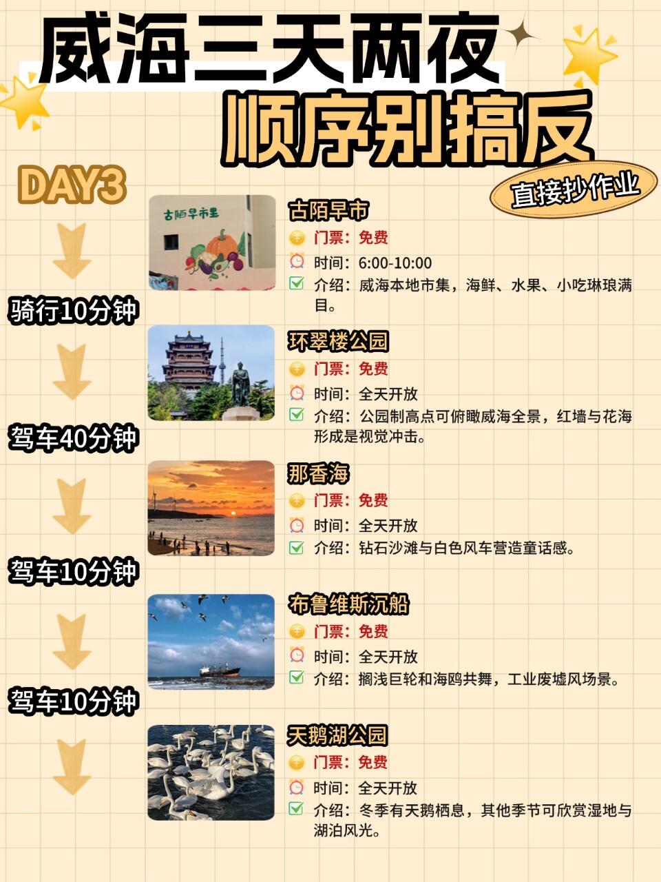 🌼 古陌早市→ 🌳 环翠楼公园 → 💧 那香海 → 🚢 布鲁威斯沉船 → 🦢 天鹅湖公园