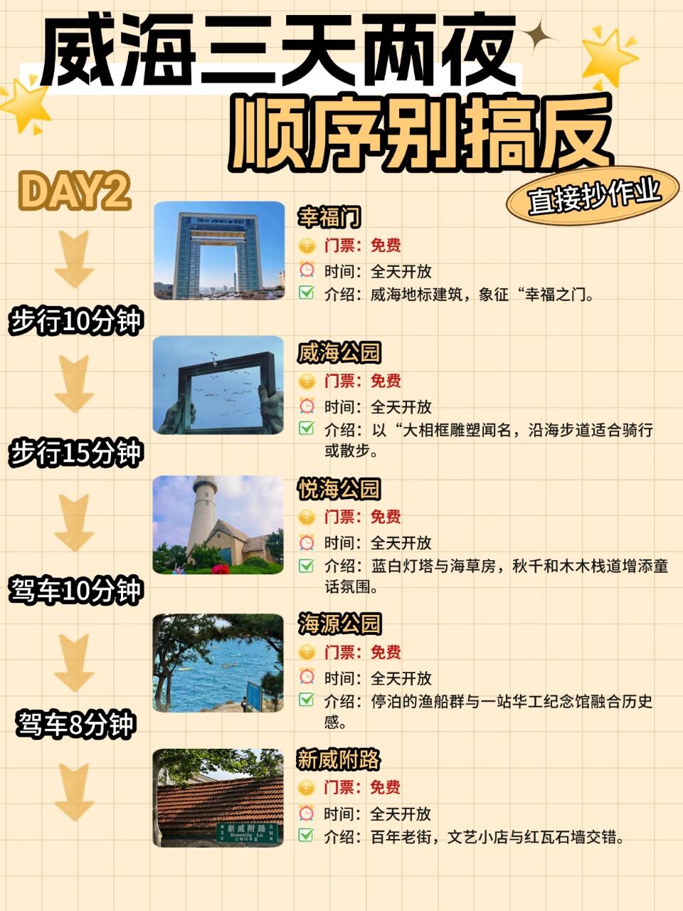 🌊 幸福门 → 🖼️ 威海公园 → 💡 悦海公园 → 🖼️ 海源公园 → 👣 新威附路 →🦞巧克力渔家