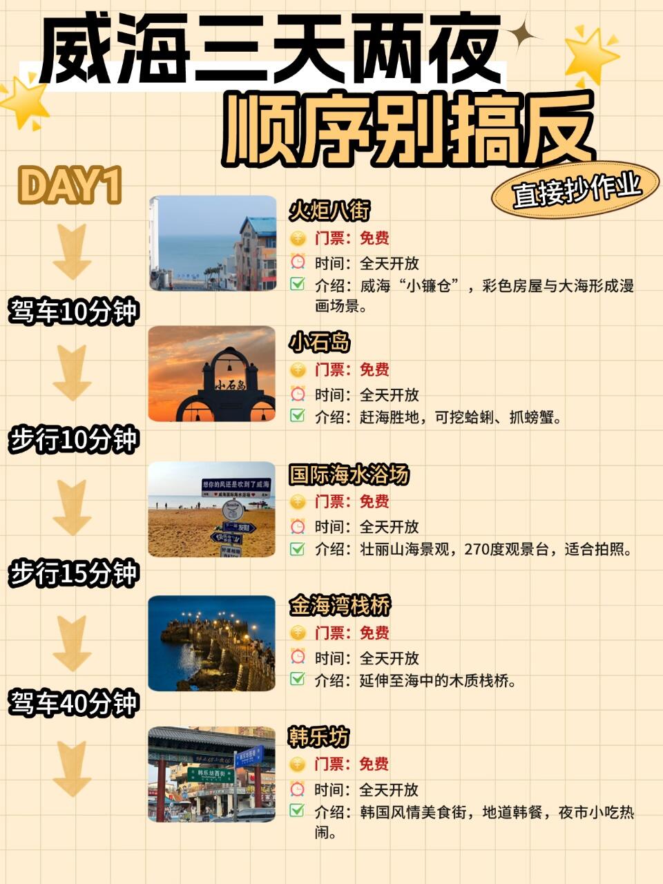 🏝️ 火炬八街 → ⛵ 小石岛 → 🏖 国际海水浴场 → 🌉 金海湾栈桥 → 🥰 韩乐坊