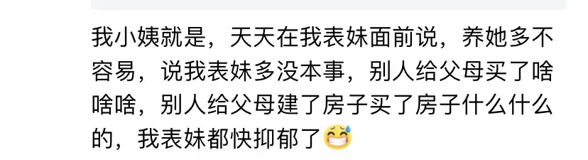 7网友说:我小姨就是,天天在我表妹面前说,养她不容易,说我表妹没本事,别人给父母买了啥,给父母建了房子,买了房子什么什么的,我表妹都快抑郁了。