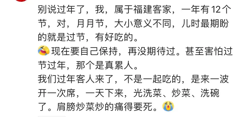 9网友说:不喜欢过节过年,真的很累人。过年客人来家里了,来一波开一次席,一天下来,光洗菜、炒菜、洗碗了,肩膀炒菜炒得痛得要死。