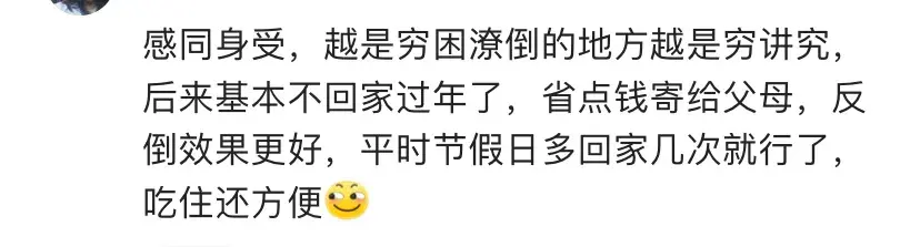 4网友说:感同身受,越是穷困潦倒的地方,越是讲究,后来基本不回家过年了,省点钱寄给父母,反倒效果更好,平时节假日多回家几次就行了,吃住还方便。