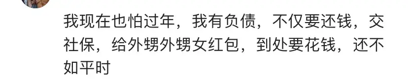 2网友说:我也怕过年,有负债,不仅要还钱,交社保,给外甥外甥女红包,到处要花钱,还不如平时。