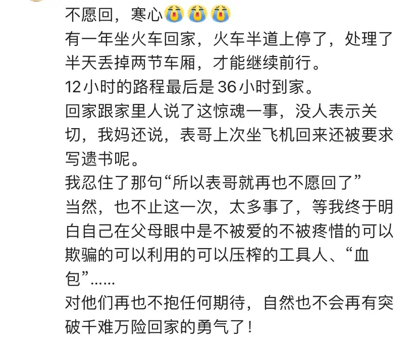 五、可能从小到大对父母家人感情不深,对回家过年没有特别的期待。