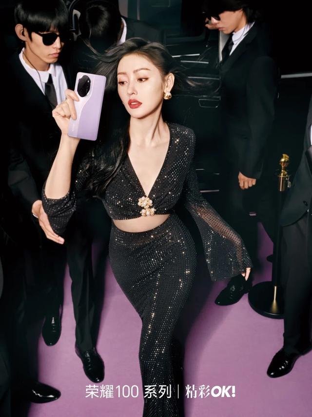 近日,人气演员张天爱在某社交平台上分享了荣耀100系列单反级写真相机“红毯大片”。照片中,张天爱身穿黑色亮片长裙,手中拿