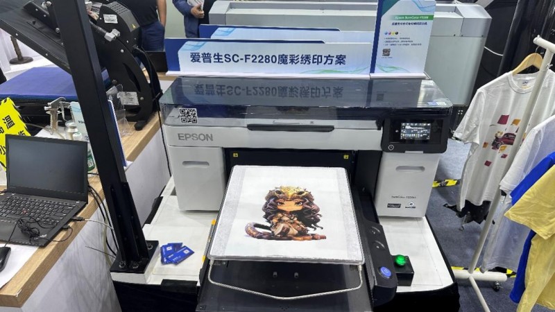 在爱普生展位最中央展出的Epson SureColor F2280魔彩绣印方案,可应用于数码印花行业和绣花行业,具有精准定位、降本增效、色彩艳丽的特点,可明显区别于传统绣花方案的绣印效果。其不仅能够满足用户成衣直喷与薄膜转印需求,打印各种日常生活中的时尚休闲服饰;还能够为用户呈现更精美、更高性价比的刺绣数码印花。而爱普生展出的另一款工业级平台式专业数码印花机SC-F3080,选用了双打印头的巧妙设计,同时内置多个传感器,可自动实时调整打印头高度以实现最佳的墨滴喷射距离,保证了稳定高效的高品质打印输出。在“科技+本地化+环保”战略的指导下,爱普生通过与合作伙伴合作借助软件与高精度定位系统共创推出创新解决方案,为用户呈现了更精准、更高品质的微喷印花方案,解决了渐变等特殊设计图案难以实现的问题。同时,绣印结合的方式相较于传统绣花方案显著提高了生产效率及产品附加值,使个性化小单快反成为可能,满足了客户对高产能的生产需求,将进一步赋能中国印染产业的高质量、高效发展。