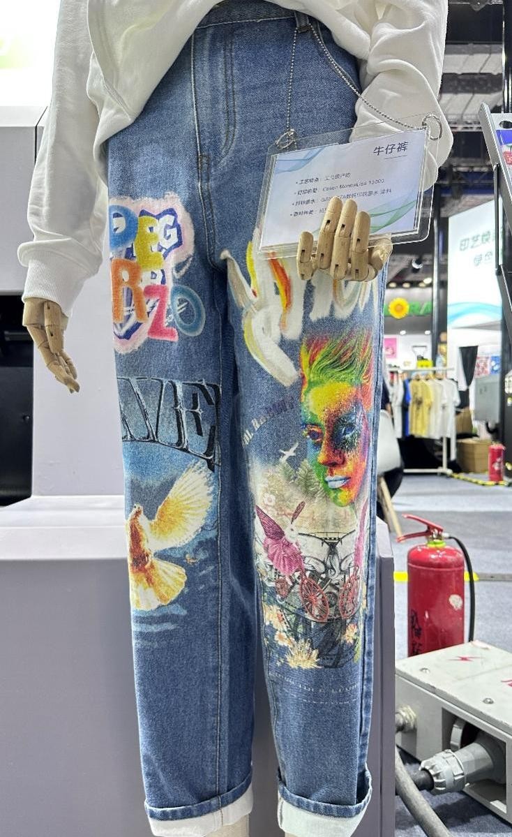 走近爱普生展台,首先进入观众视线的是本次爱普生为印染行业带来的全新产品——蒙娜丽莎13000(简称ML-13000)直喷数码印花机。ML-13000直喷数码印花机采用了创新的一体式涂料数码印花解决方案,无需额外的设备进行前、后处理以及蒸化和水洗,极大地减少了牛仔布生产中的水资源消耗,达到97%的节水效果*2。该产品通过Epson Edge Print PRO X系列RIP智能软件,实现墨水与功能性处理液的精准按需打印,在节约耗材使用量的同时保留织物的原有质感。随着AI技术的应用,设计师能够将传统文化元素与现代流行趋势结合,创造出色彩鲜艳且富有文化内涵的图案,一体式方案减少前后处理为牛仔布的生产带来了新的可能性。展会现场,爱普生还通过屏幕为观众展示了ML-13000如何根据客户的身材尺寸生成合适的牛仔布料切片,再进行平面打印最后缝纫的过程,让小单快反、时尚短单成为可能。