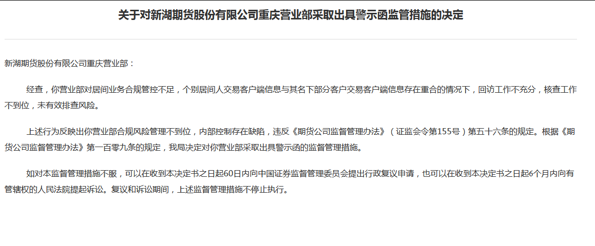 新湖期货重庆营业部收警示函,上个月公司遭上海证监局责令改正