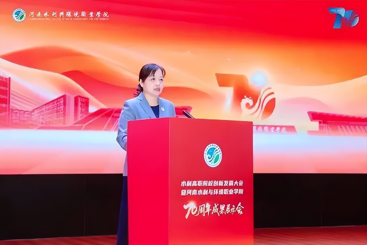 随后,河南水利与环境职业学院校长李志萍发表了题为《深耕水利职教七十载 谱写创新发展新篇章》的工作报告。她系统梳理了学校从“因水而建”的初创期、“依水而兴”的发展期到“循水而进”的跨越期的奋进历程。从百业待兴的1955年到全面振兴的2025年,河南水环学院三迁校址、八易校名,在水利事业和职业教育事业由小变大、由弱变强的历史进程中,走过了初心如磐、薪火相传、求实奋进的70年。