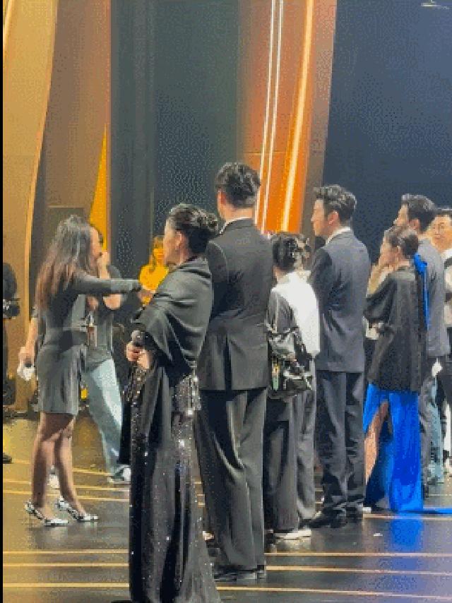 后来,快要上场的时候,梅婷、杨幂和李现三人站在一起,梅婷和杨幂在聊天,工作人员蹲下身体,好像是在给梅婷穿鞋子什么的,几个人自顾自的聊天,也没理会身下的助理。