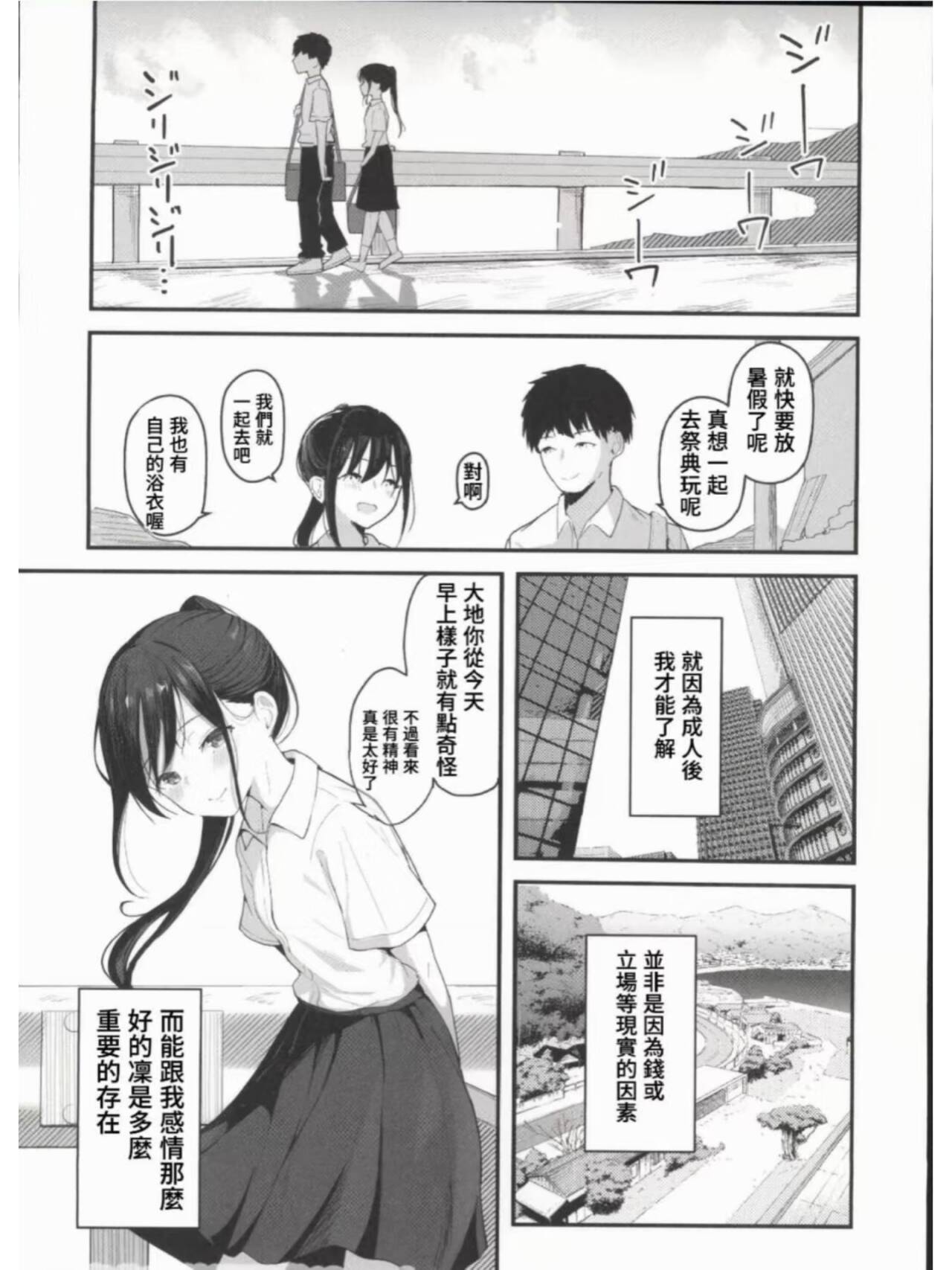 在重生后,男主角就立即行动,利用自己前世的记忆去接近女主角。然后在漫画的第一篇章两人就迅速成为了情侣,之后又通过约会和学校的活动拉近了彼此的距离。女主角刚开始的时候还惊讶男主角的主动,但很快便回应了他的热情,两人开始甜蜜交往。在第二篇章,两人的关系就进一步升温,男主角在自己内心感慨“终于实现了梦想”。约会的场景描写详细,强调纯爱中的情欲,女主角从害羞转为享受。