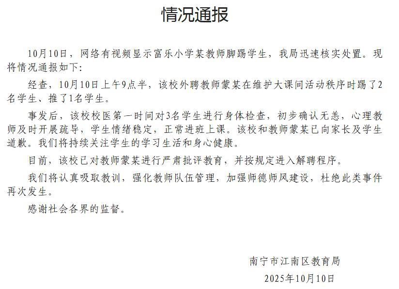 10月10日晚,南宁市江南区教育局发布情况通报:经查,10月10日上午9点半,该校外聘教师蒙某在维护大课间活动秩序时踢了2名学生、推了1名学生。