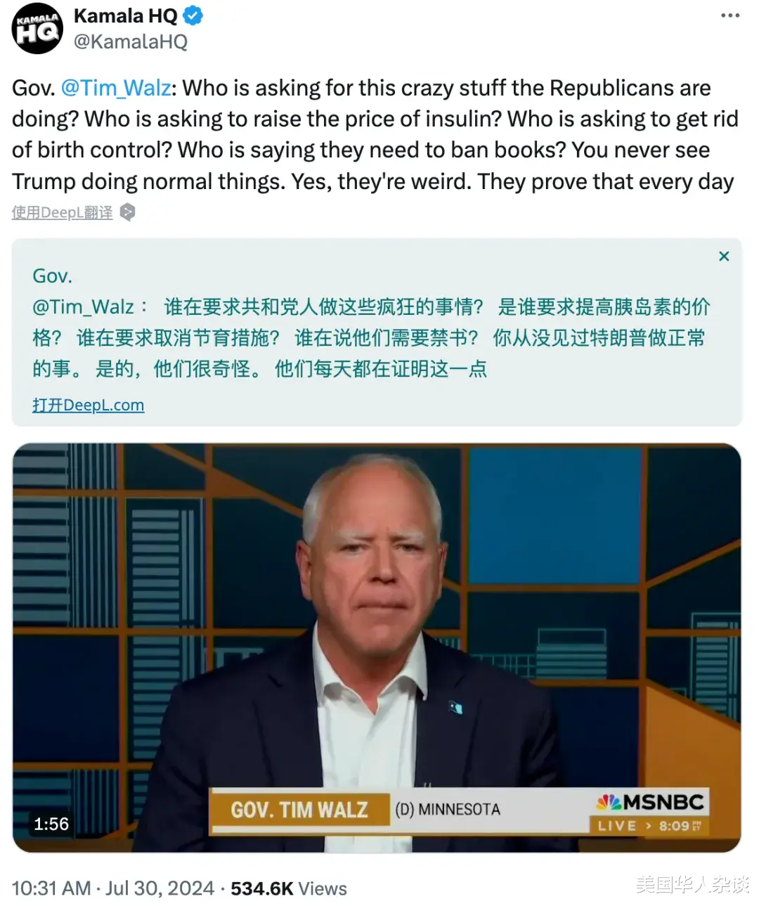 而在另一场采访中他说:“是谁在让共和党做这些疯狂的事情?是谁要求提高胰岛素的价格?是谁要求取消避孕措施?是谁在说他们需要禁书?你从来没见过川普做正常的事情。是的,他们很奇怪。他们每天都在证明这一点。”