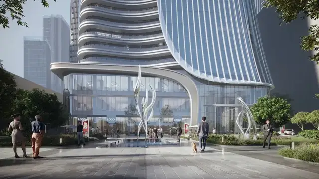 项目整合了底层商业与上部办公功能,通过独立动线设计使两种业态互不干扰。办公大堂层高挑空,选用香槟金金属与石材搭配,营造出典雅而精致的入口体验。地面景观通过线性图案引导人流,与建筑纵向造型形成对话。